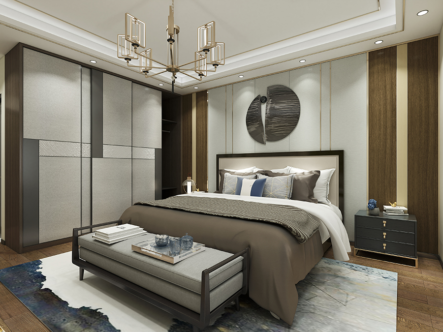 本案例设计为新中式风格,以木纹集成墙板为主,为空间注入沉稳、质朴的气息,用手抚摸就能感受自然传递出温润的质感,仿佛人与物之间存在必然的联系。